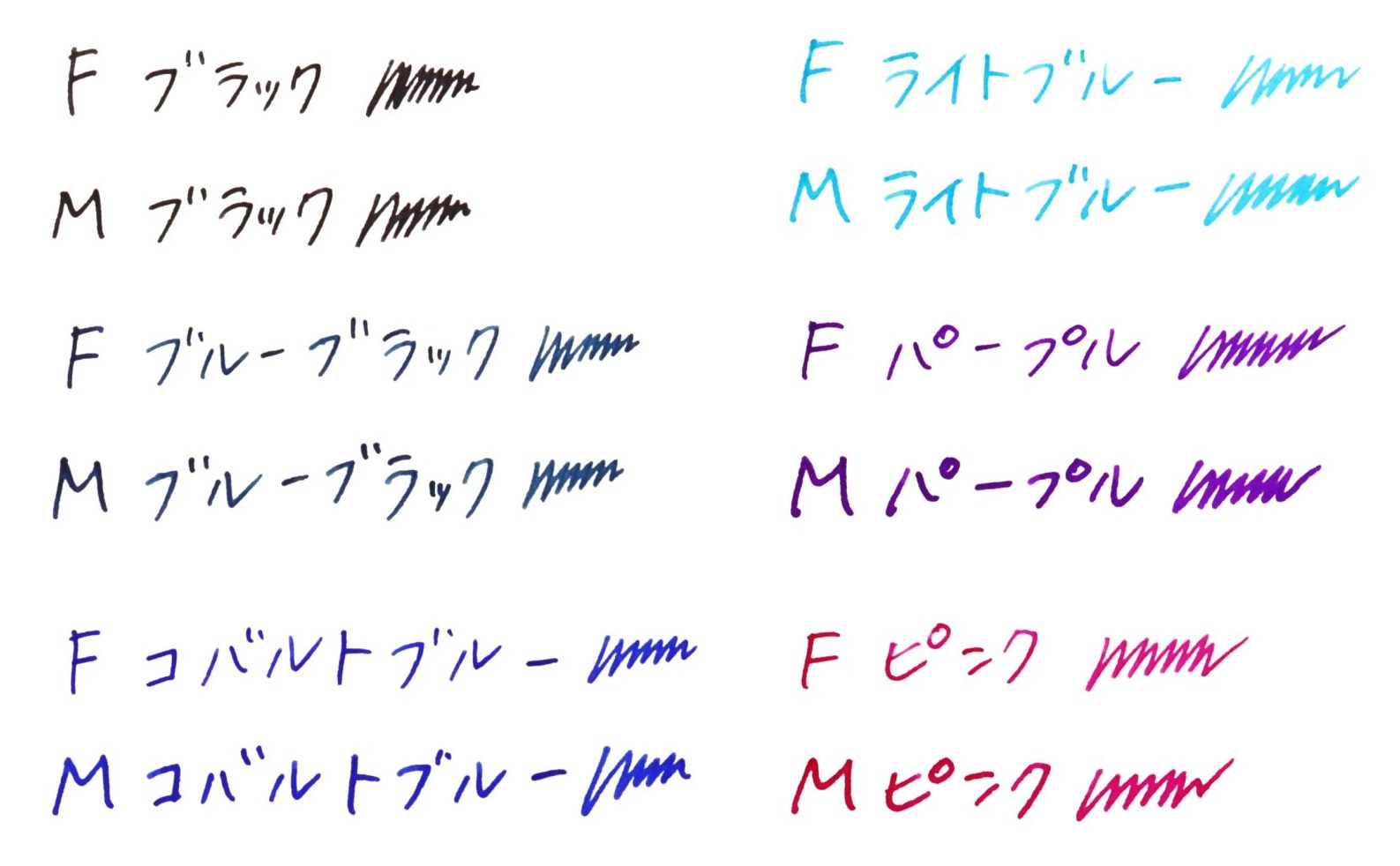 商品には、定番のF字(細字)ペン先に加え、付け替え可能なM字(中字)ペン先もセットされています。M字はF字よりもインクの濃淡が出やすく、万年筆ならではのインクの表情を楽しむことができ、文字を書くだけでなく、アート作品など多彩な用途で活躍します。
