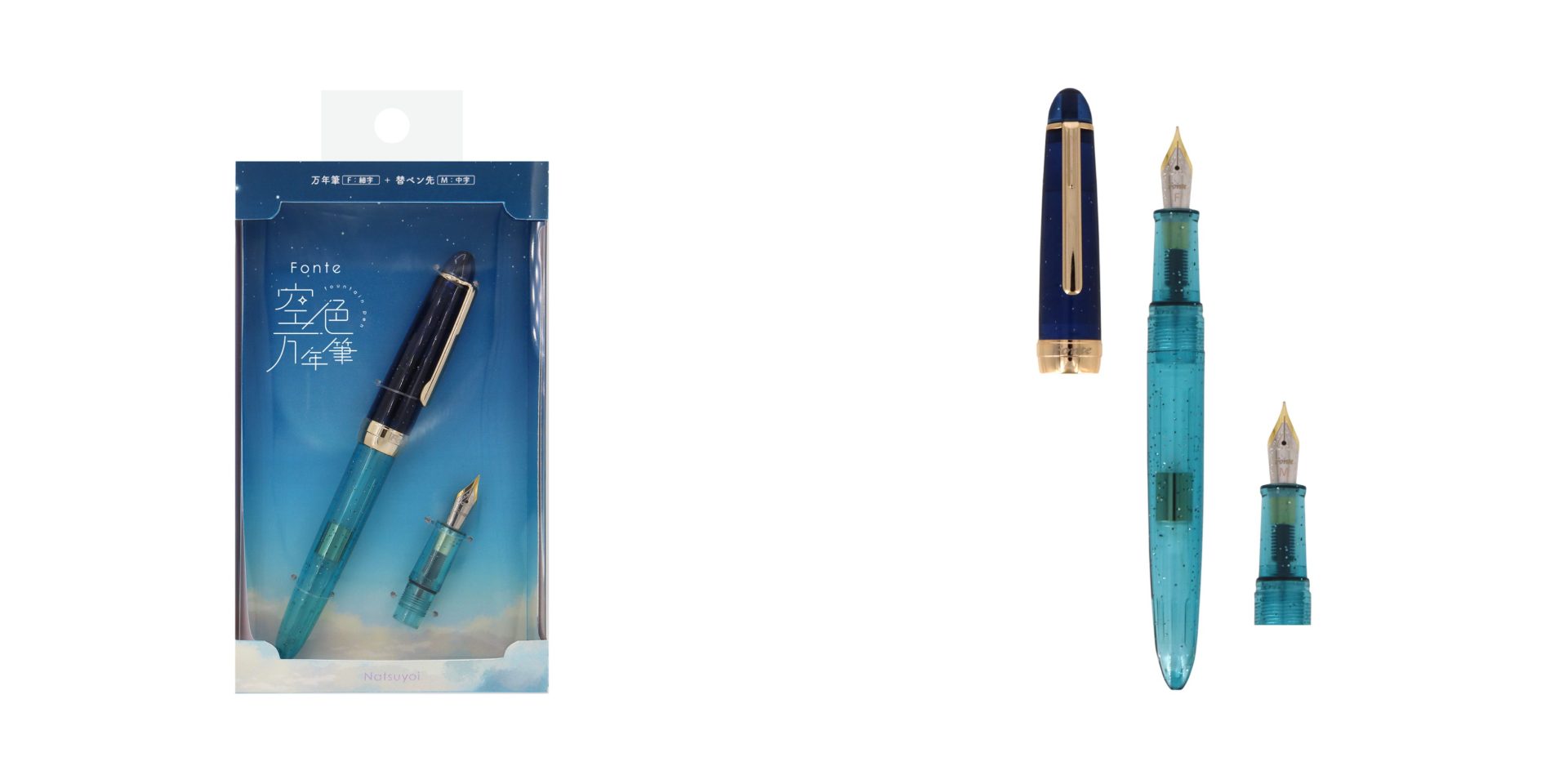 新商品「Fonte 空色万年筆」は、日本ならではの四季をテーマに、季節×時間によって移ろう空の色を、空に瞬く星々をイメージしたラメ入りのボディと、微妙に異なる色合いのキャップの組み合わせによるグラデーションで表現しています。