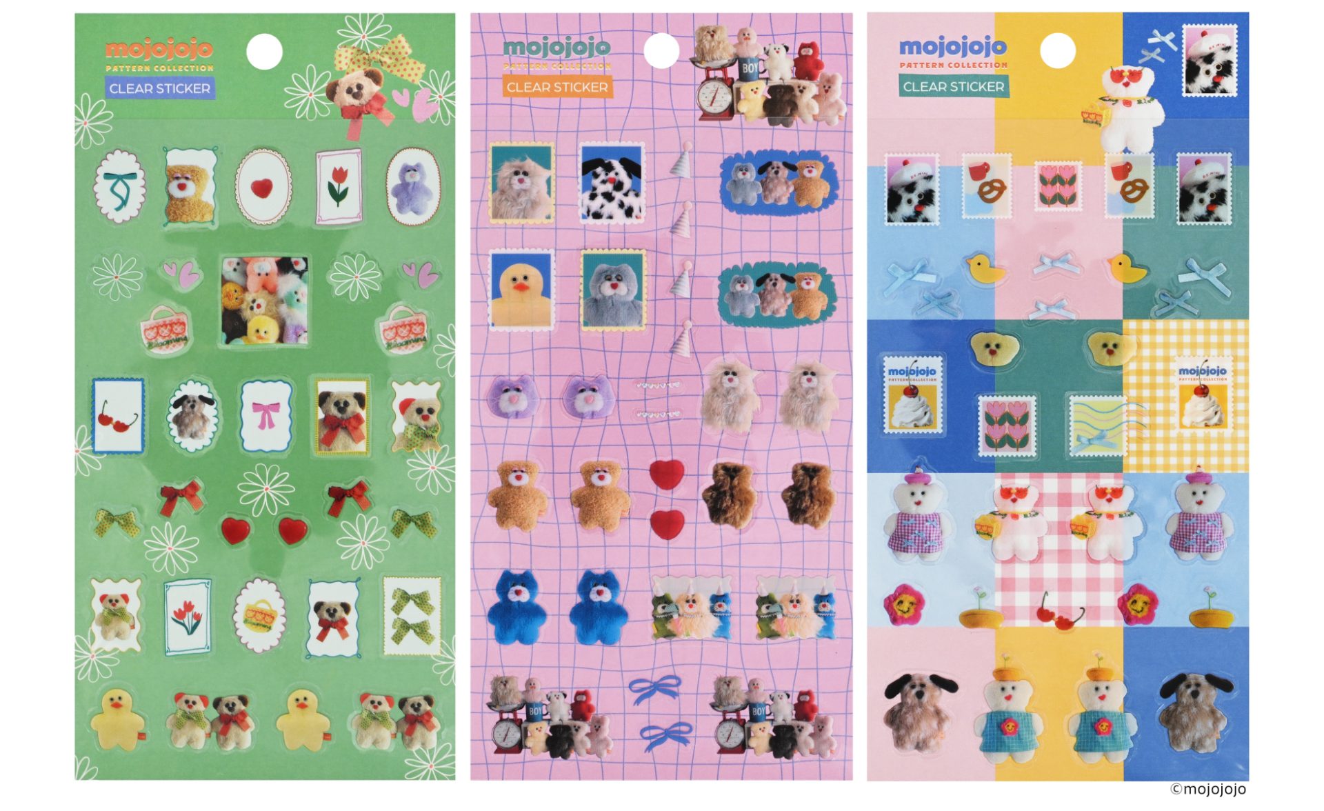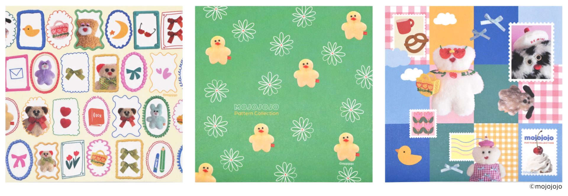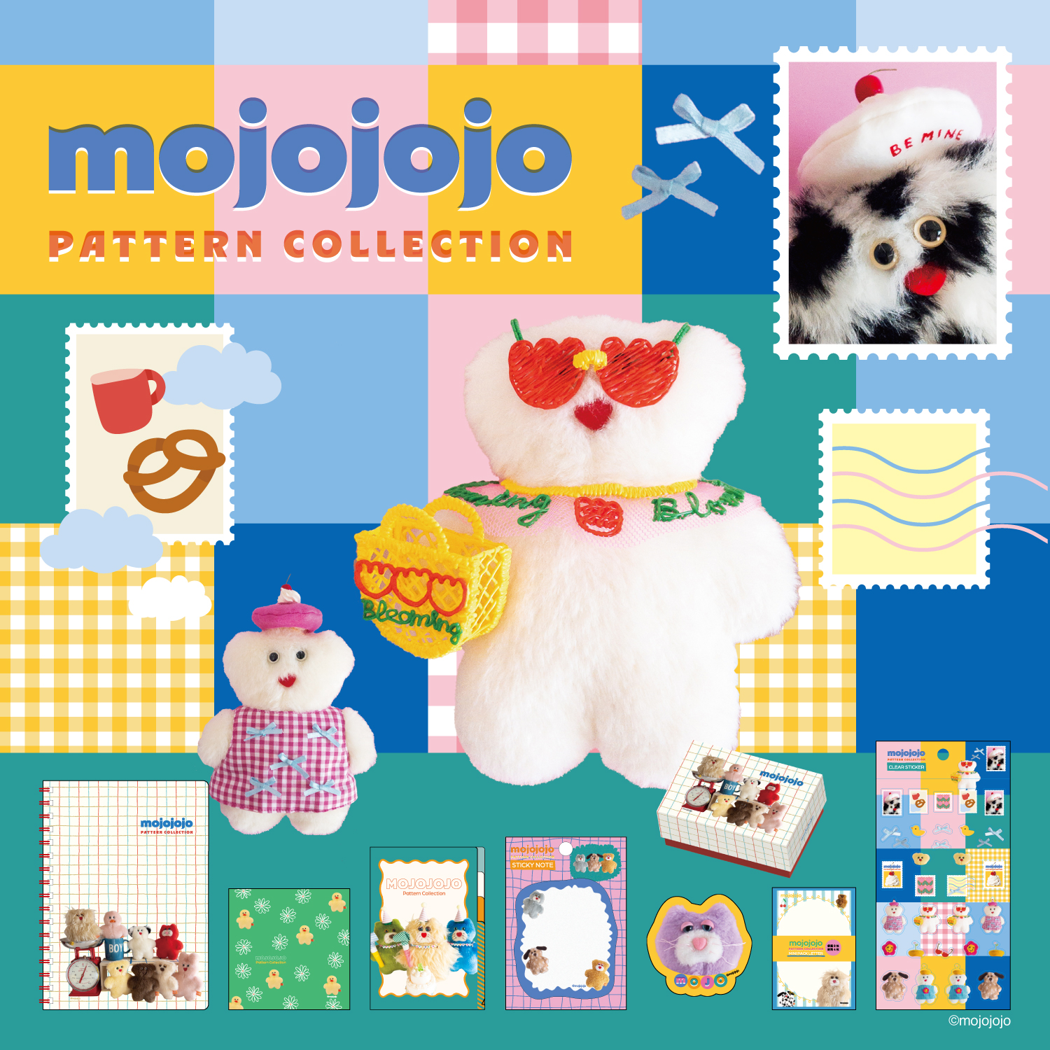 今回の新作は、「PATTERN COLLECTION」がテーマとなり、洋服や帽子を身に着けておしゃれをしたぬいぐるみたちを、チェック柄やストライプ柄、リボンや花などのモチーフで、ポップにデザインしたシリーズとなっています。
