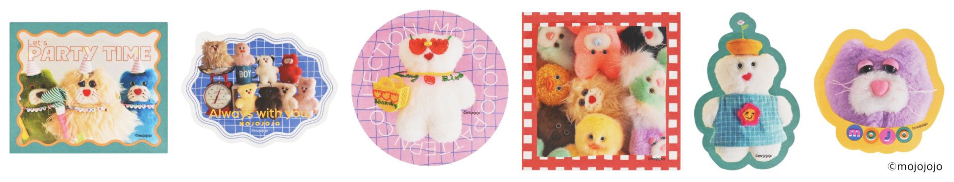 ラインナップは、シールやメモ、ノートなどの紙もの文具を中心とした全8アイテムです。レトロなカラーリングの柄や模様とmojojojoの世界観がマッチしたかわいいデザインです。シールには帽子やリボンなどのパーツの絵柄も含まれているので、着せ替えのように楽しむこともできます。
