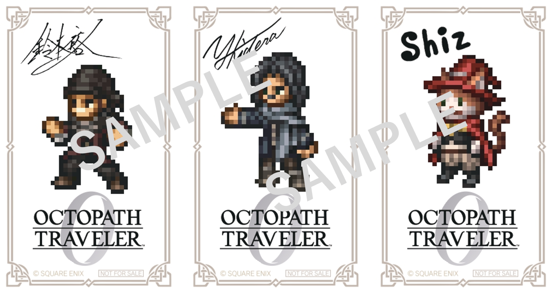 また、POPUP SHOP開催店舗では、『オクトパストラベラー0』開発者の一日店長イベントも開催します。イベント当日は、プロデューサーの鈴木裕人氏、ディレクターの木寺康博氏、ピクセルアーティストの森本志津佳氏を迎え、写真撮影会や、購入グッズへのサイン会が実施されます。さらに、参加者には本イベント限定の「鈴木プロデューサー」カード、「木寺ディレクター」カード、「森本ピクセルアーティスト」カードも配布されます。
