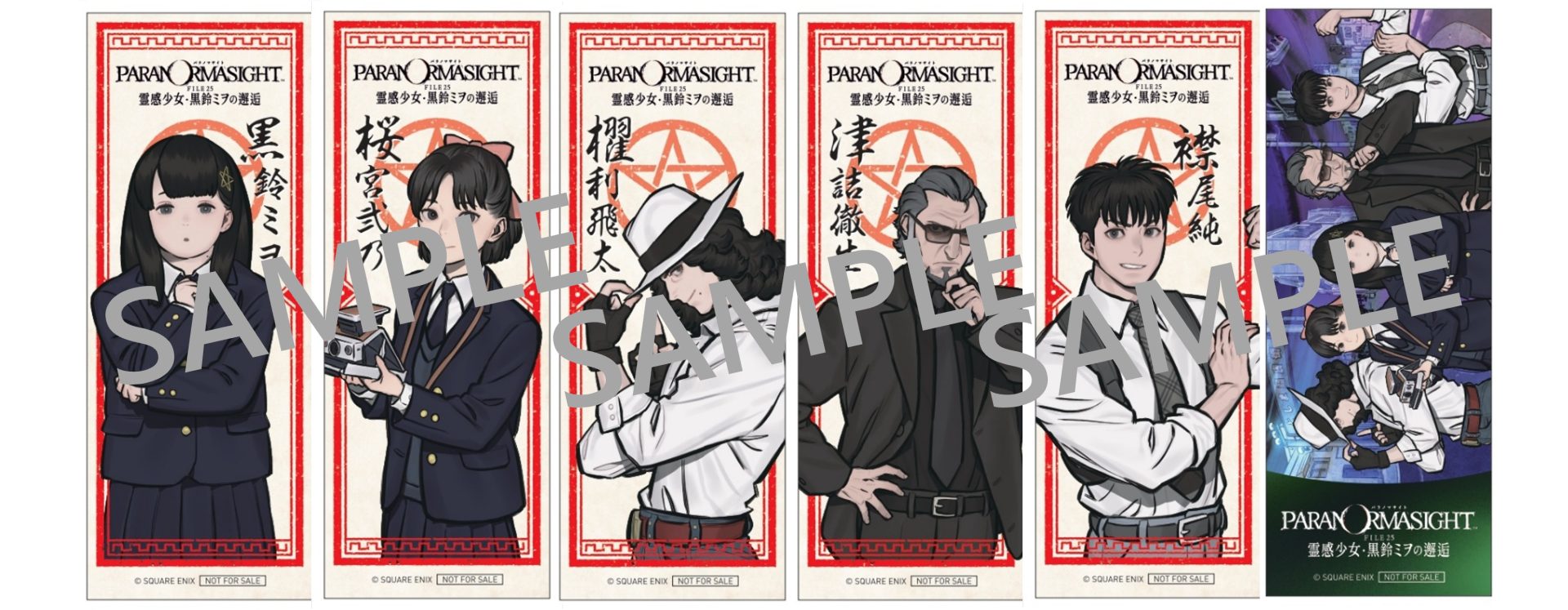 オリジナルしおりは、ゲーム「パラノマサイト FILE23 本所七不思議」のキャラクター原案を担当した小林元氏による描き下ろしイラストを使用し、ゲームの登場キャラクター(黒鈴ミヲ、櫂利飛太、津詰徹生、襟尾純)に加え、コミックス『パラノマサイト FILE25 霊感少女・黒鈴ミヲの邂逅 上巻』の主人公・桜宮弐乃を含む5人と、集合イラストを含む全6種です。